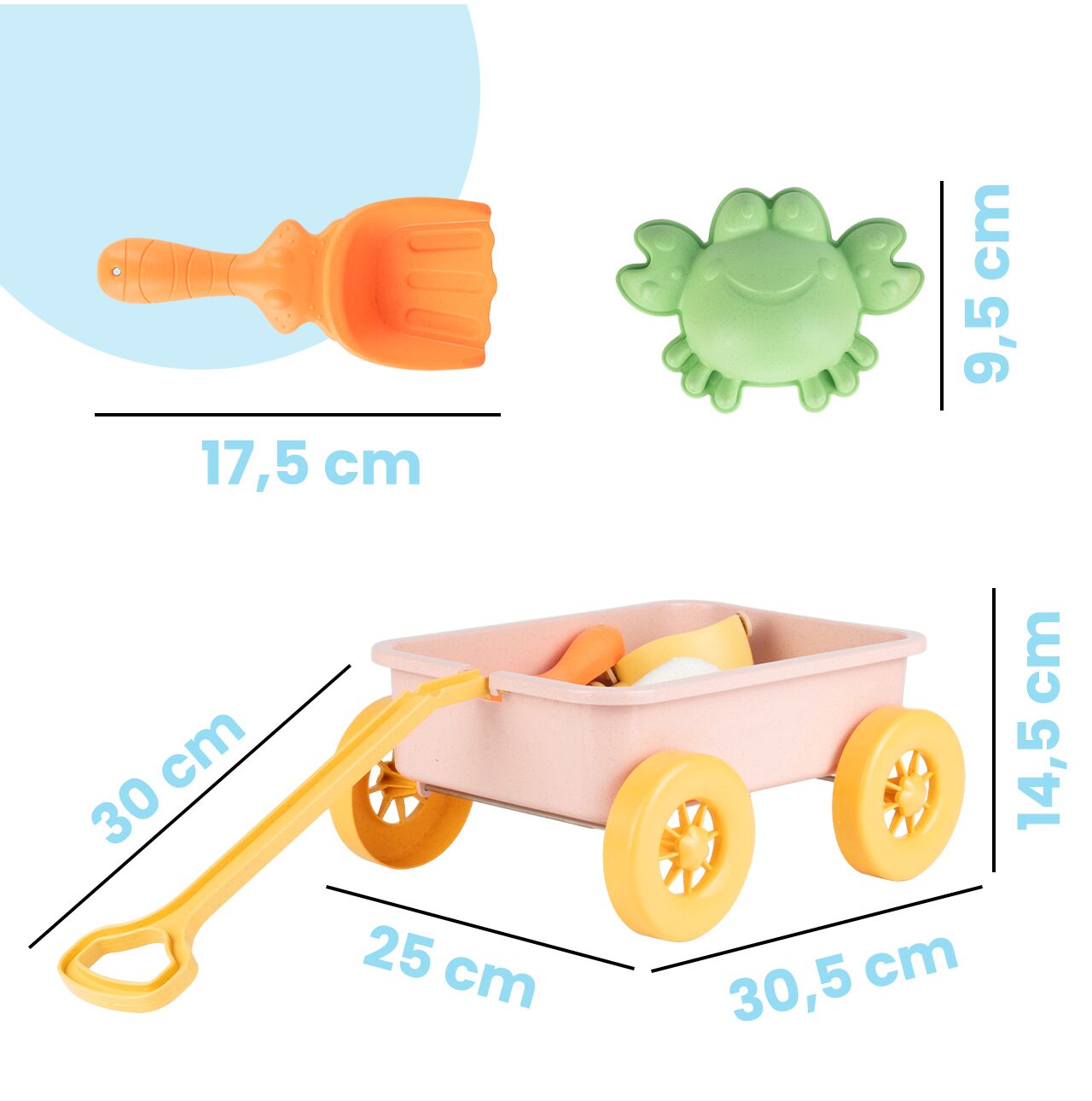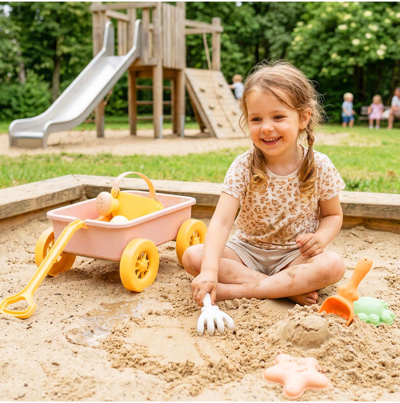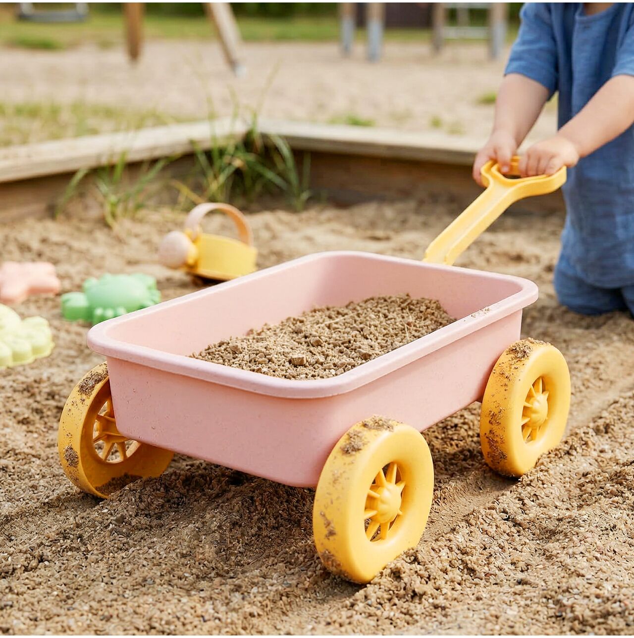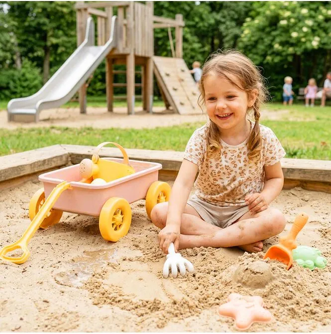 • Wózek do piasku w zestawie – dziecko może przewozić piasek, foremki i akcesoria jak w prawdziwej zabawie na budowie