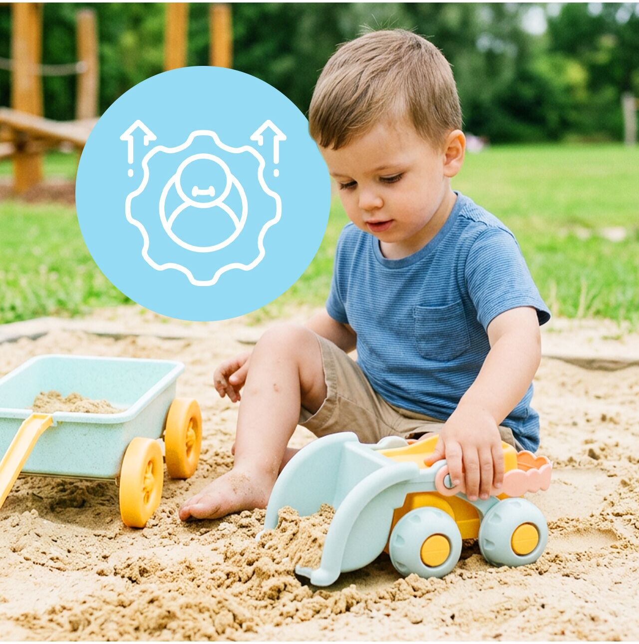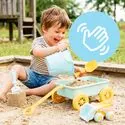To nie jest zwykły zestaw do piasku, gdzie akcesoria po chwili lądują porozrzucane wokół dziecka. Tutaj centralnym elementem jest pojemny wózek, do którego można nasypać piasek, wrzucić zabawki i przewieźć wszystko tam, gdzie akurat trwa zabawa. Dziecko czuje, że naprawdę coś transportuje, a to mocno podkręca zaangażowanie.