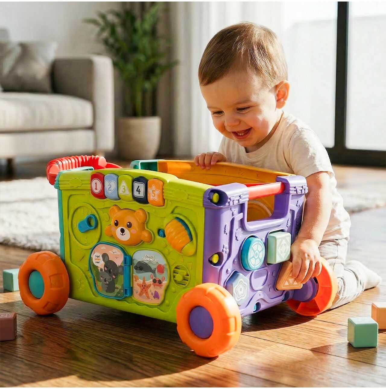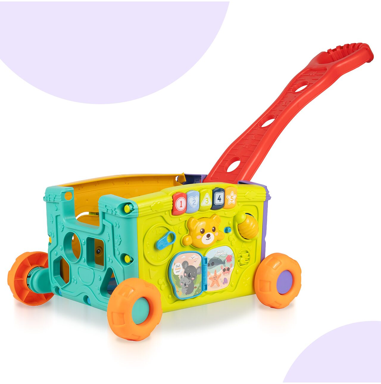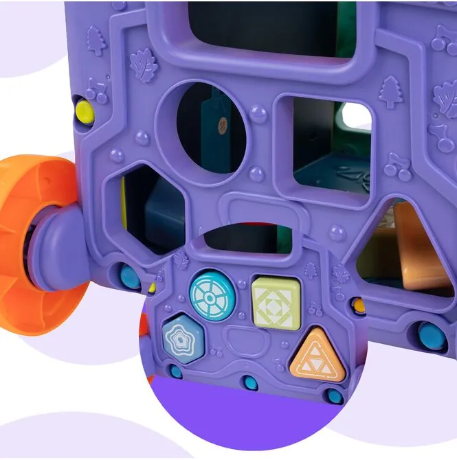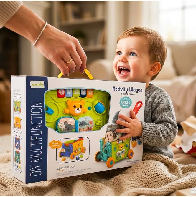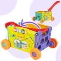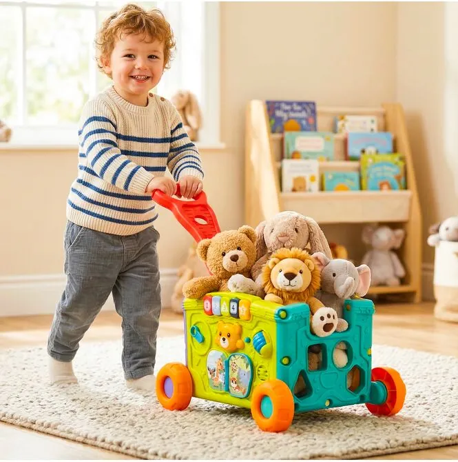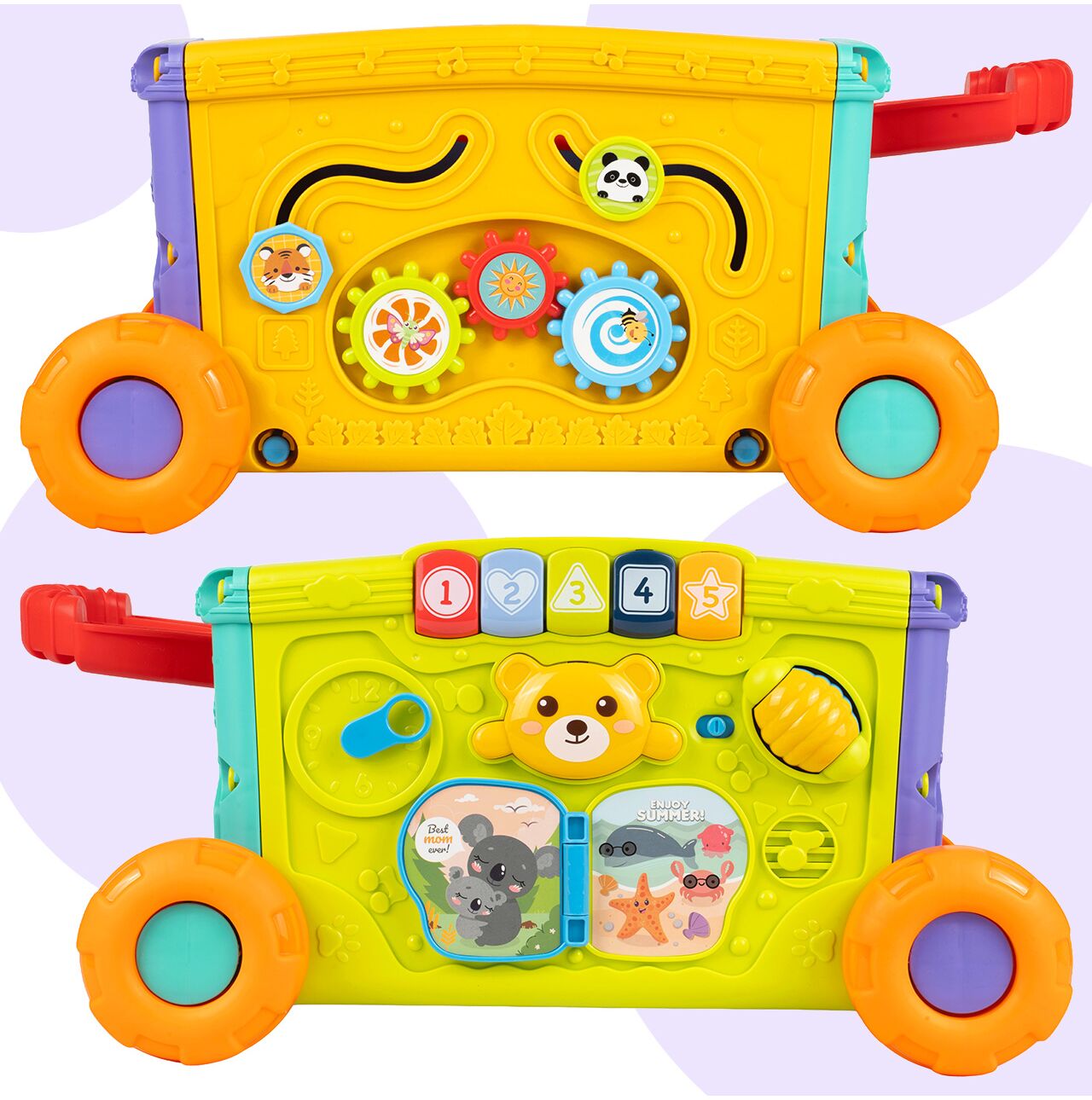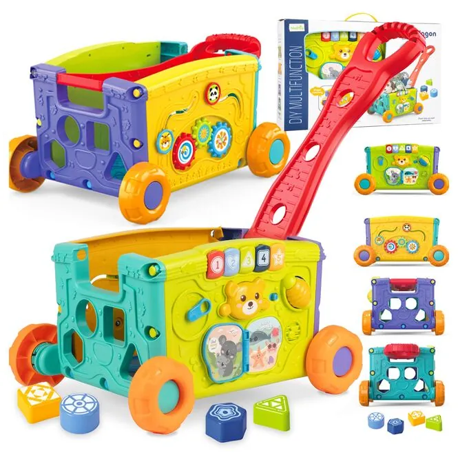 • 2w1: wózek i zabawka edukacyjna – dziecko może go ciągnąć lub pchać, a jednocześnie bawić się aktywnymi panelami z każdej strony