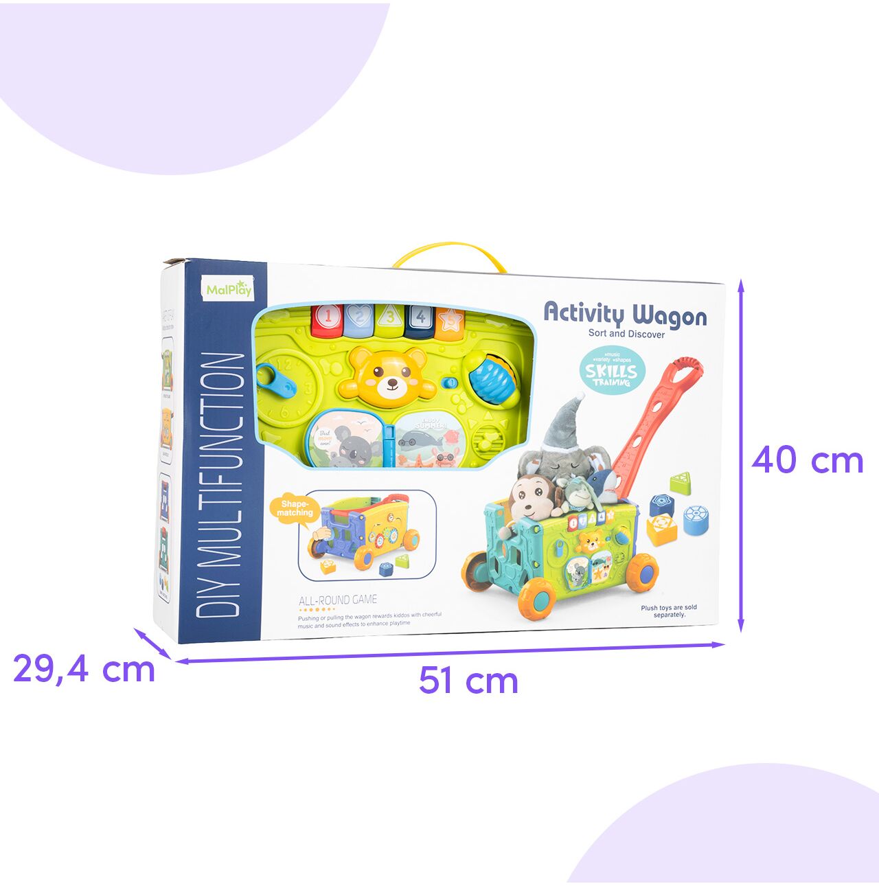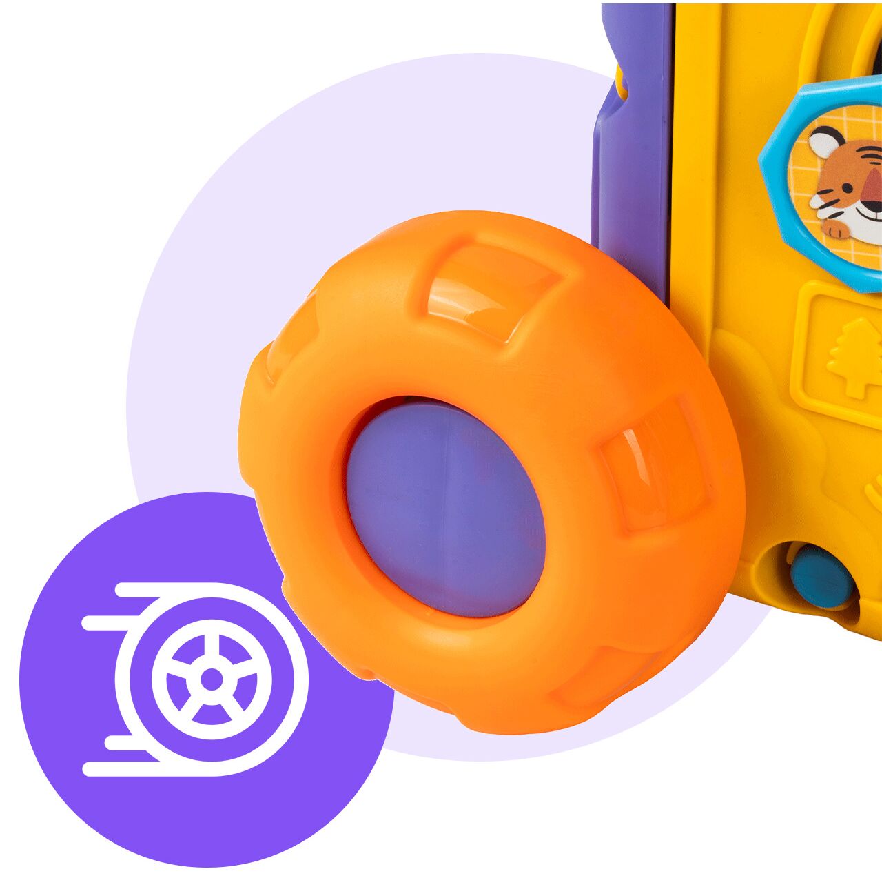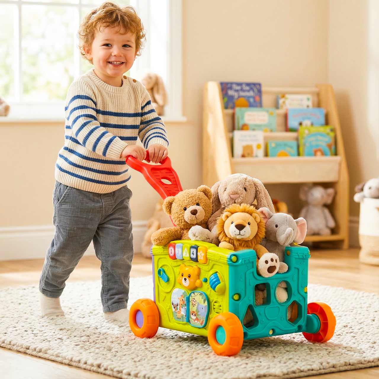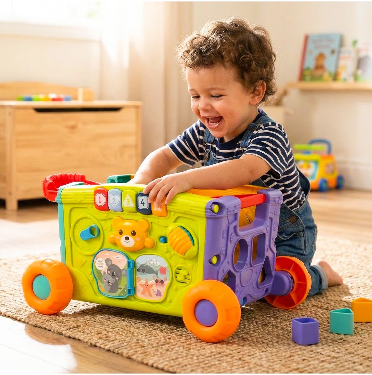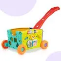 • 2w1: wózek i zabawka edukacyjna – dziecko może go ciągnąć lub pchać, a jednocześnie bawić się aktywnymi panelami z każdej strony