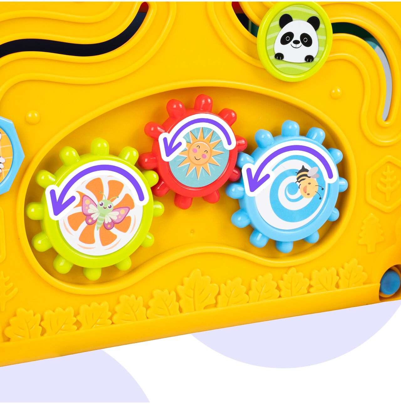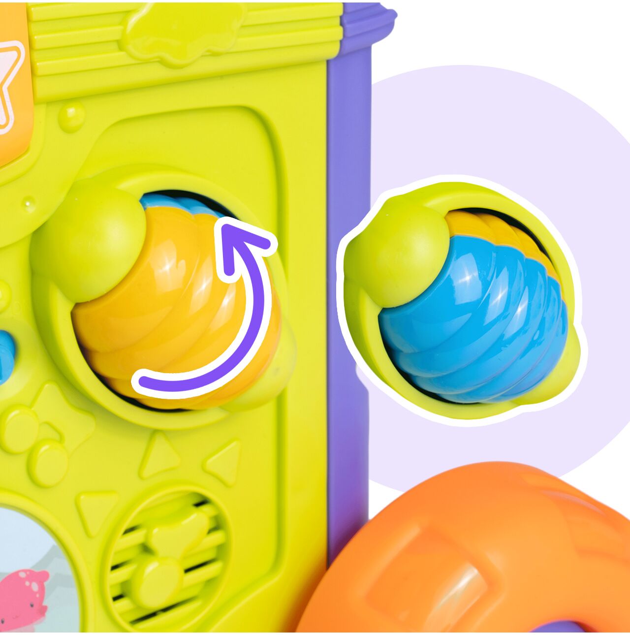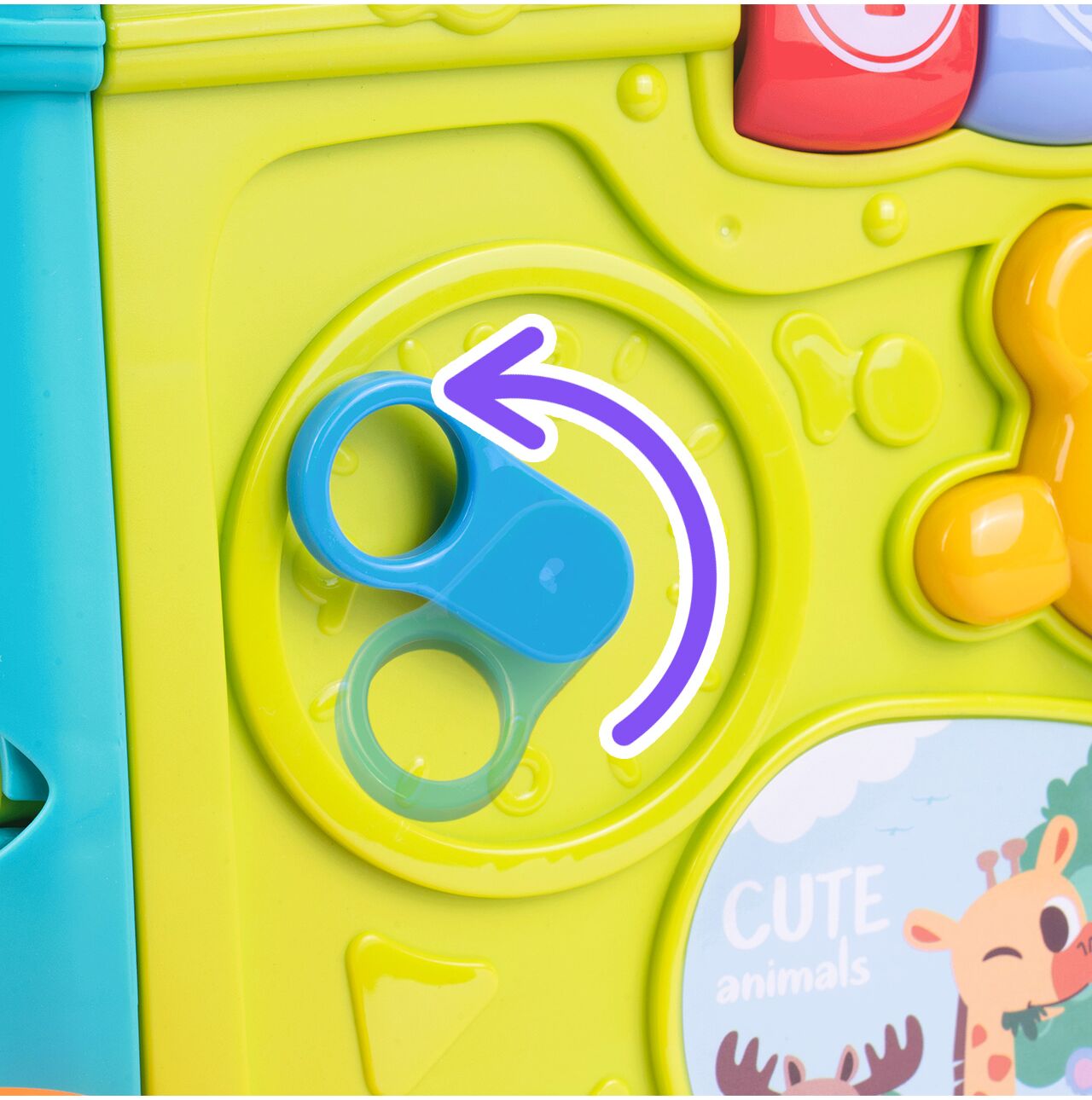 Warto zwrócić uwagę także na obrotowe elementy i detale sensoryczne. To nie są przypadkowe ozdobniki, tylko funkcje, które angażują dotyk, wzrok i ruch dłoni. W praktyce oznacza to dłuższą, ciekawszą i bardziej rozwijającą zabawę.