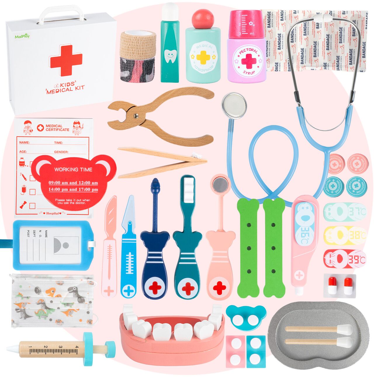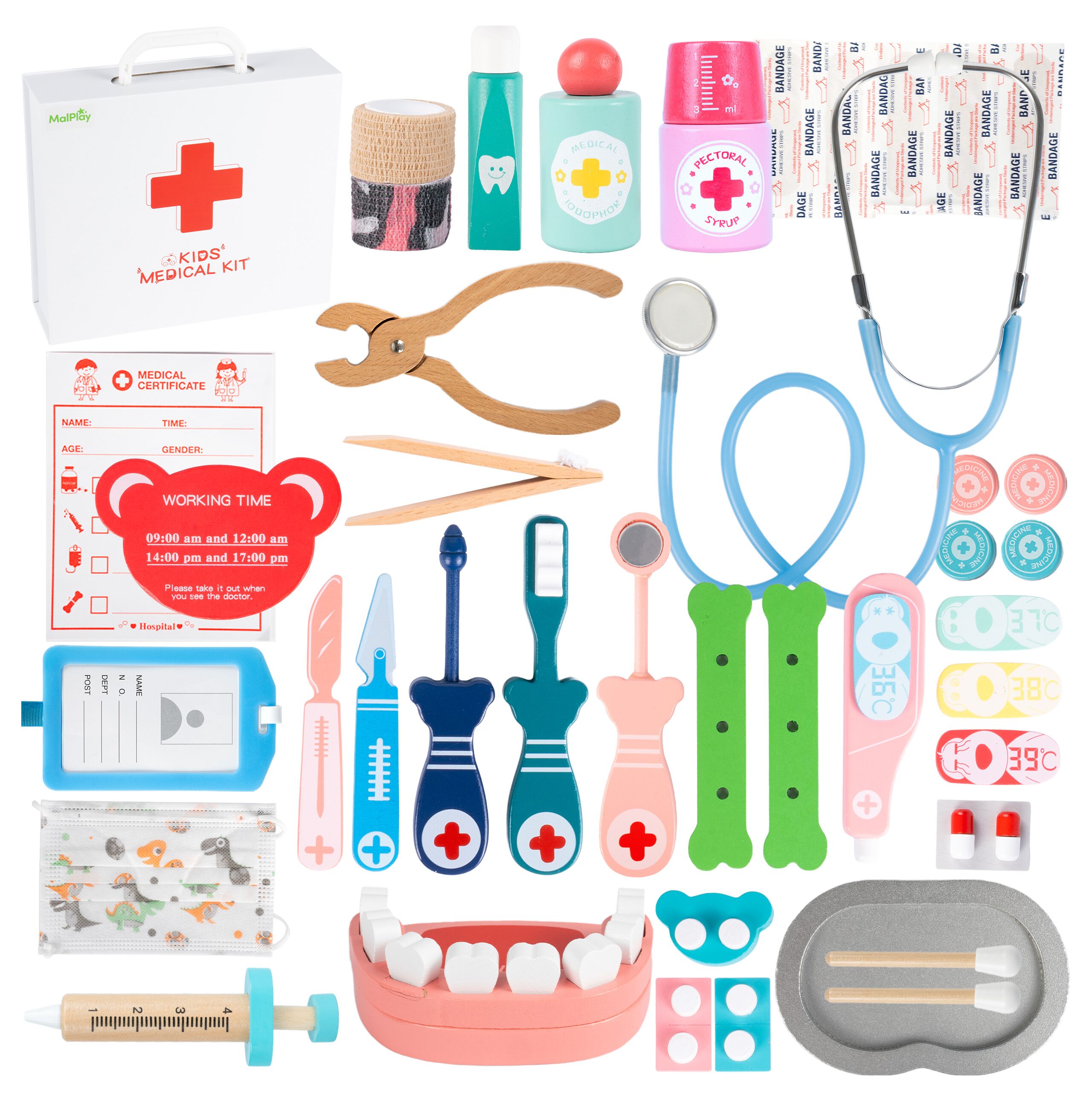 W komplecie znajduje się wiele elementów, które urozmaicają zabawę i pozwalają tworzyć własne scenariusze leczenia. Dziecko może przeprowadzać badania, podawać lekarstwa, wykonywać kontrolę uzębienia i opiekować się misiem, lalką albo domownikami. Duża liczba akcesoriów sprawia, że zabawa nie nudzi się szybko i daje jeszcze więcej możliwości każdego dnia.