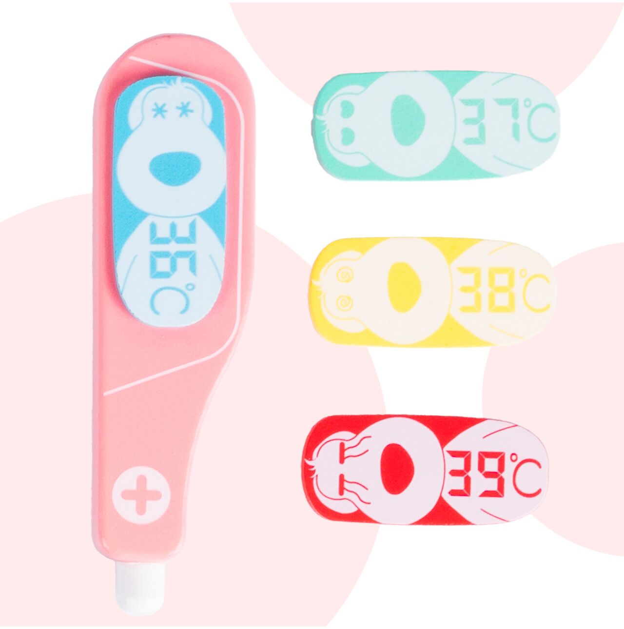 Termometr to jeden z najciekawszych elementów zestawu, który pozwala sprawdzać temperaturę i odgrywać różne sytuacje medyczne. Dzięki wymiennym wskazaniom dziecko może decydować, czy pacjent jest zdrowy, czy wymaga opieki i leczenia. Taki detal sprawia, że zabawa staje się jeszcze ciekawsza, bardziej realistyczna i daje mnóstwo możliwości tworzenia własnych historii.