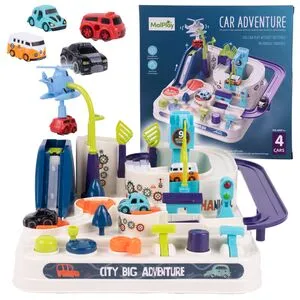 У набір входить 6 машинок і кольорові елементи, з яких дитина може скласти вежу висотою приблизно 43 см.